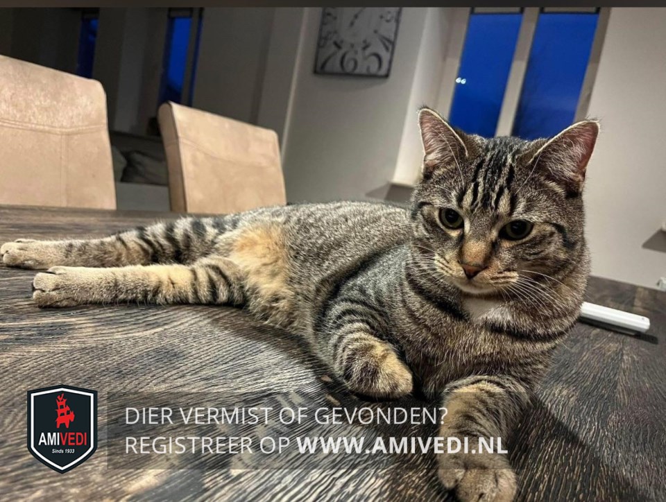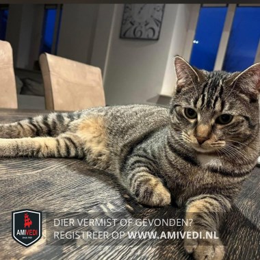 | Signalement | Bruin, zwart gestreepte kater met een wit plekje op zijn bef. Mooie zwarte strepen op zijn achterpoten en rondom zijn bef. |