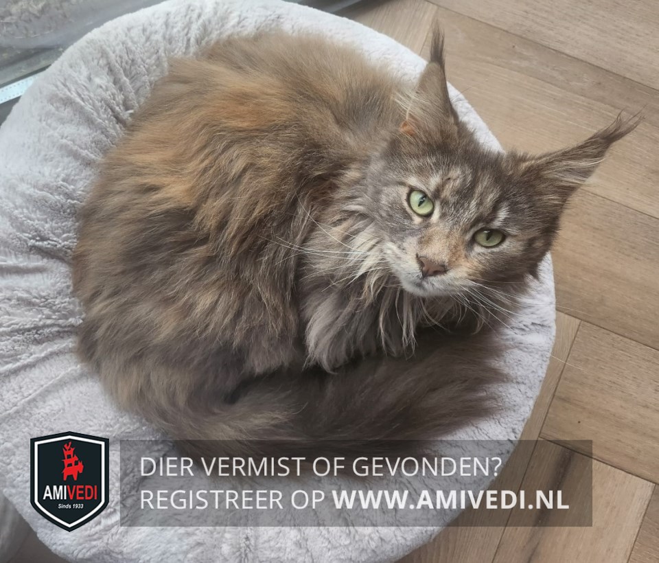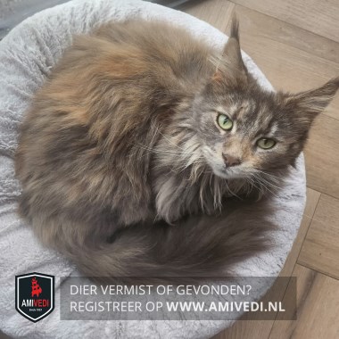 | Signalement | Grijs/beige/rood/bruin gemeleerde langharige kat met pluimpjes aan haar oren. |