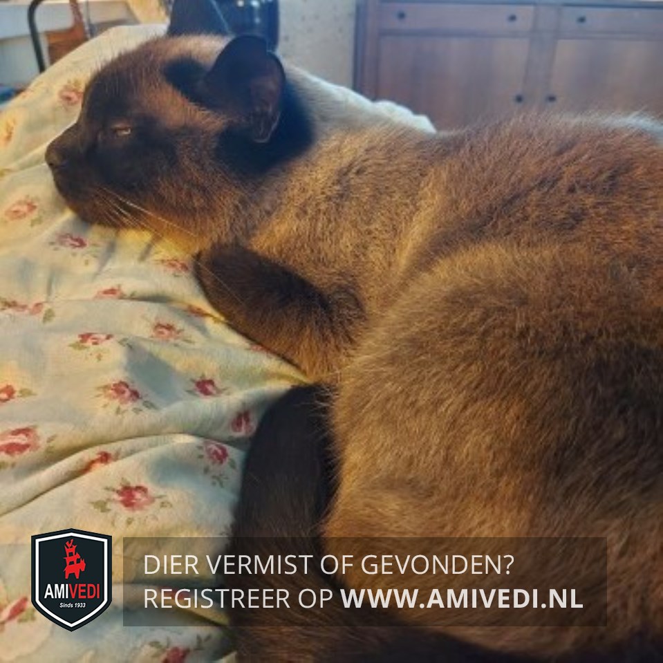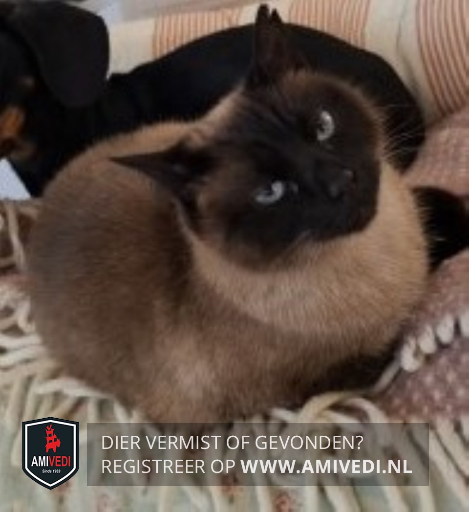 | Signalement | Siamese poes. Colourpoint, zwarte kop, beige kraag en bruin lijf. Poten en staart zijn zwart. Blauwe ogen en kleine scheur in linker oor. |