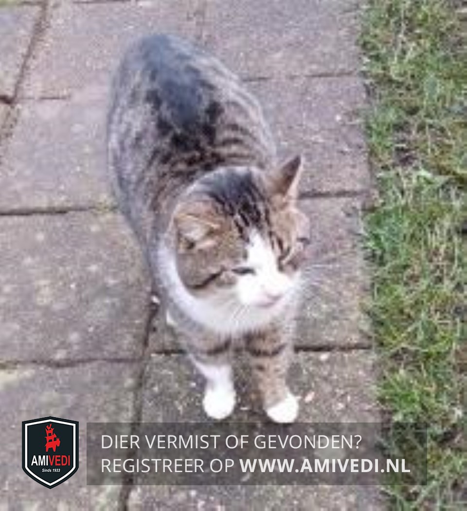 | Signalement | Cypers grijs/zwart met witte snoet, bles tot rechts midden over het oog, witte kin, bef, kraag, borst en buik, links voor wit voetje, rechts voor witte laars aan de voorkant, achter niet zichtbaar op de foto's. |
