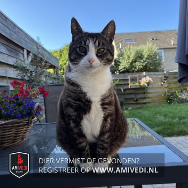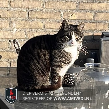 | Signalement | Cypers grijs/bruin/zwarte kater. Cypers grijs/bruin/zwart op het kopje dat doorloopt over en langs de oogjes. Wit neusje, roze neuspunt, witte hals en brede witte bef. Witte strook over de mag dat breder doorloopt over de buik. Witte teentjes. Rechteroog is “kapot”, grijze waas. MEDICATIE AFHANKELIJK. |