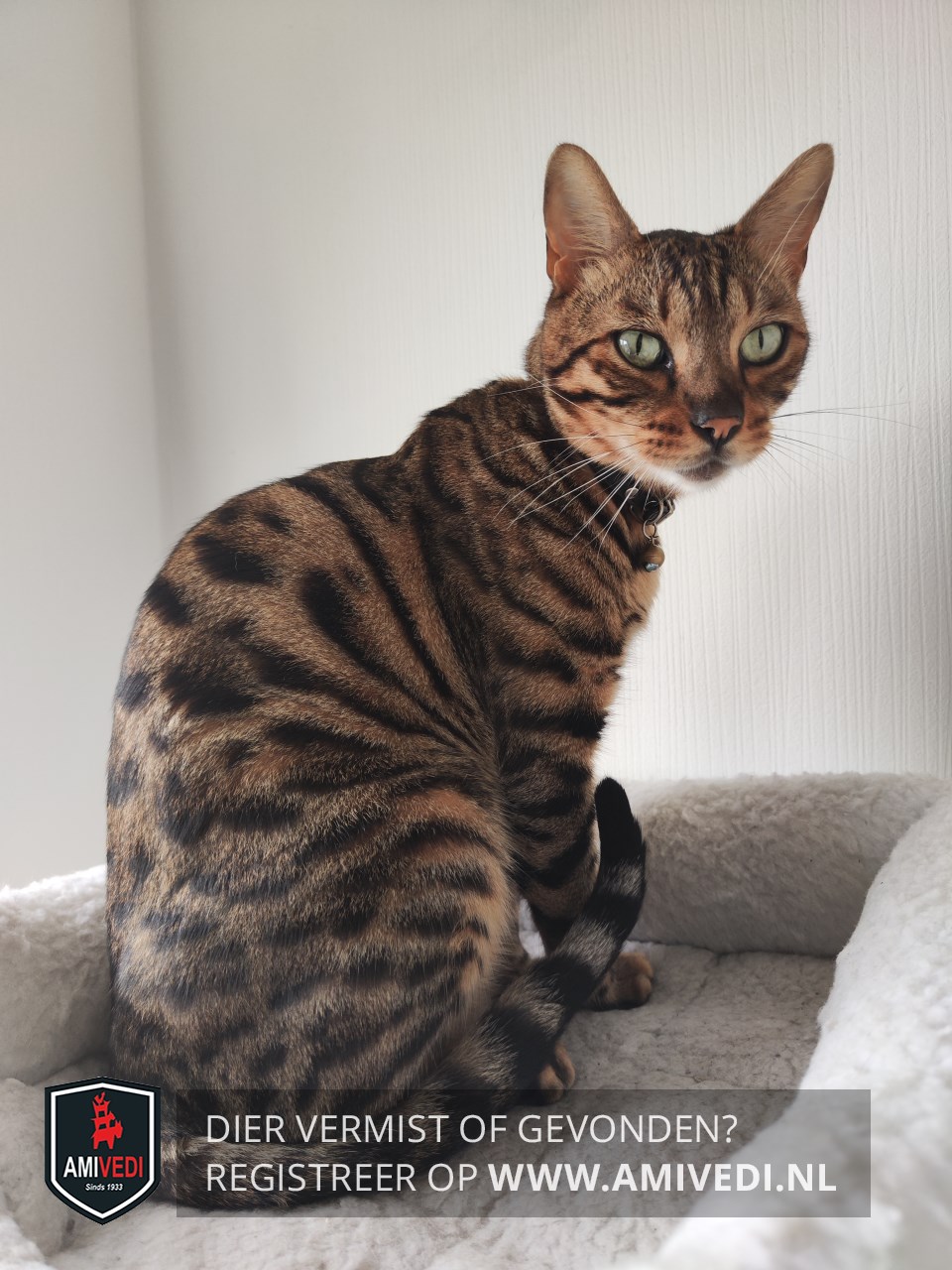 | Bandkleur 1 | zwarte halsband met een belletje en zwarte ster als penning met zijn naam en telefoonnummer. |