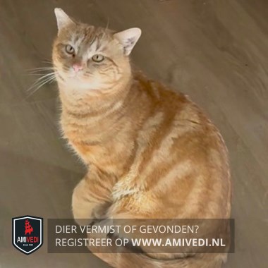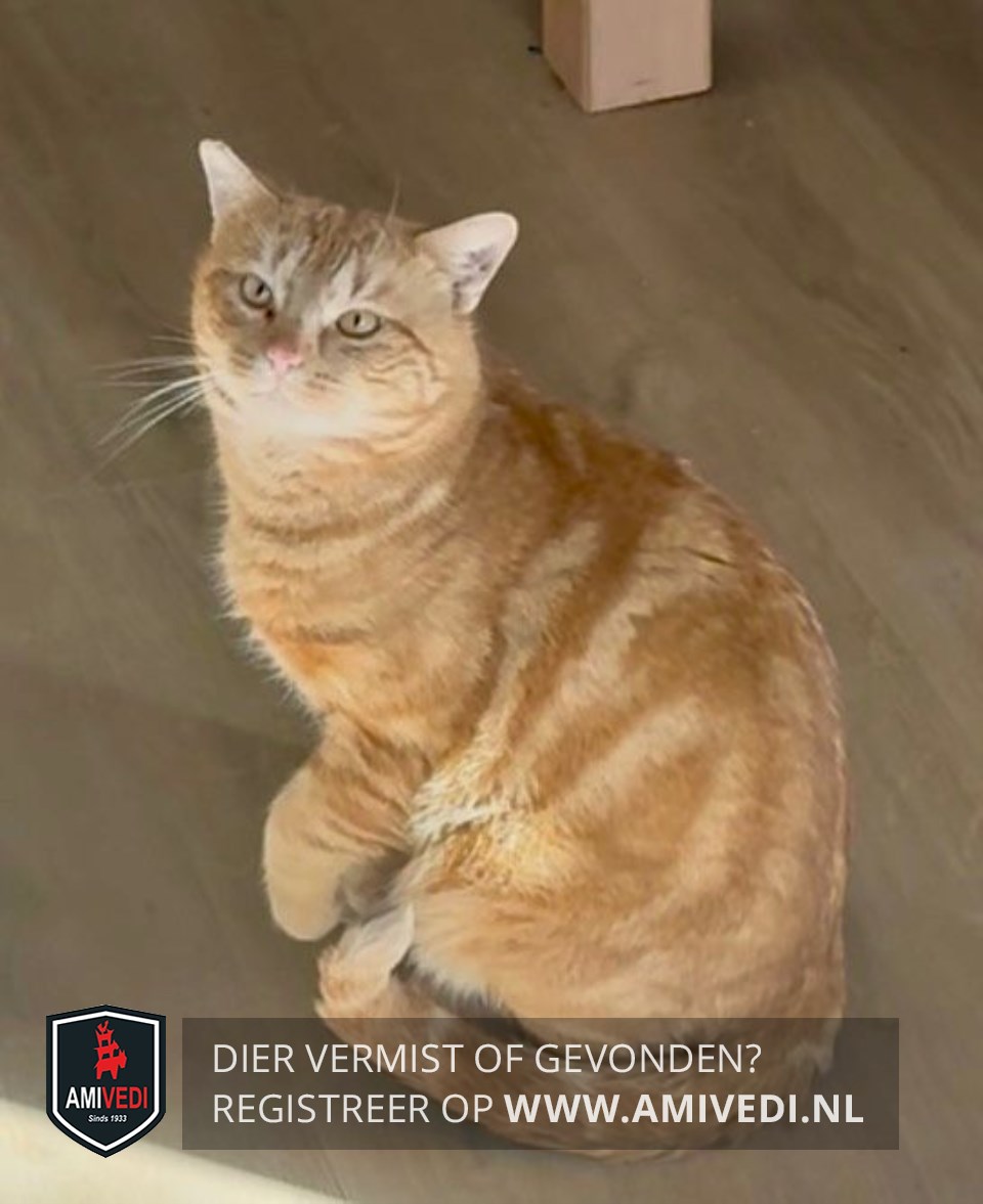 | Signalement | Oranje kater met marmerprint en licht gekleurd bekje. Heeft wat 'stijve' achterpootjes waardoor hij een opvallend eigenaardig loopje / huppeltje heeft. Mauwt hard. |