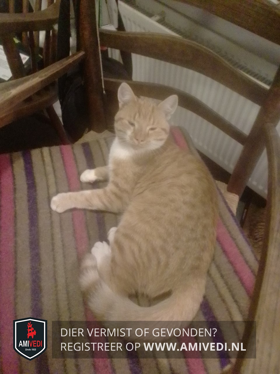 | Signalement | Cypers rood-oranje, witte bef, 3 witte voetjes, linker voorpoot witte teentjes. |