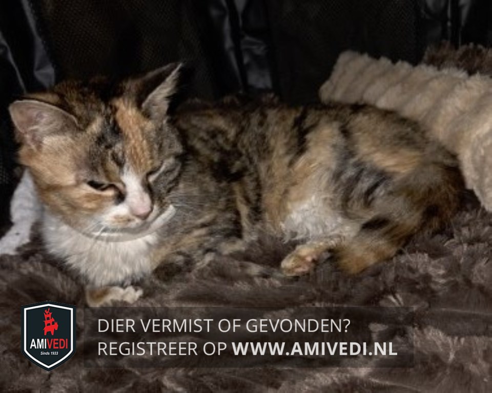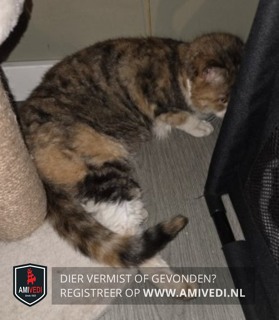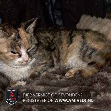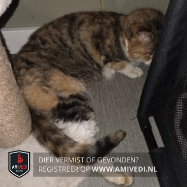 | Signalement | Poes met een vacht in de kleuren bruin en rood/oranje. In het aangezicht wit op de neusbrug en rond het bekje, wit loopt via de hals door naar de borst. Op de onderbuik witte haren. Gele ogen, roze neusje en witte snorharen. De voorpoten hebben witte sokjes, de achterpoten witte laarsjes. Ze draagt een wit vlooienbandje. Erg mager en enigszins uitgedroogd. |