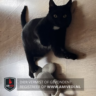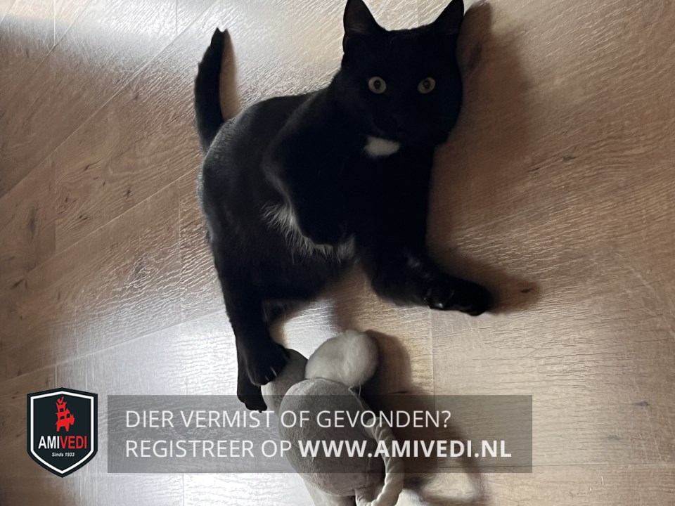 | Signalement | Zwart met witte bef en witte haartjes op buik. |