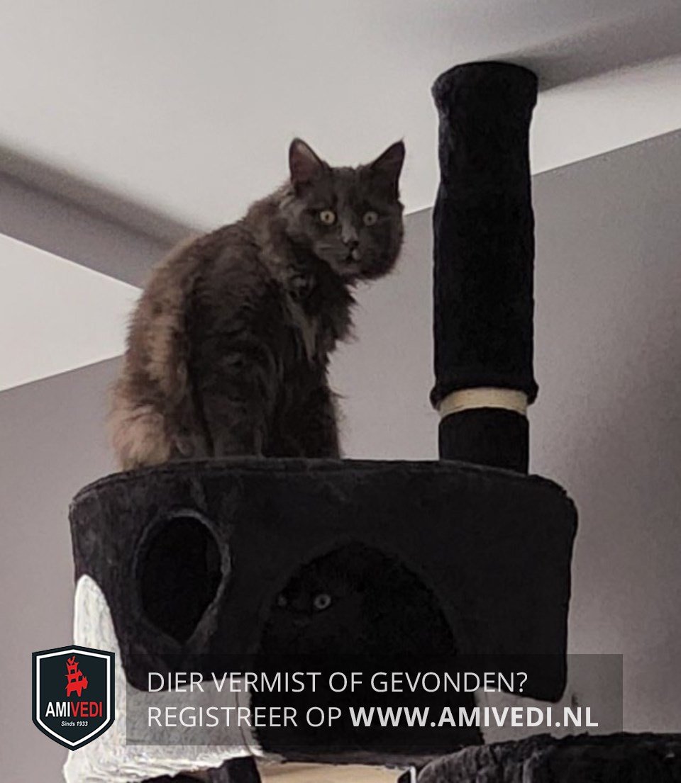 | Signalement | Grijs met licht vlekje links onder de neus. |