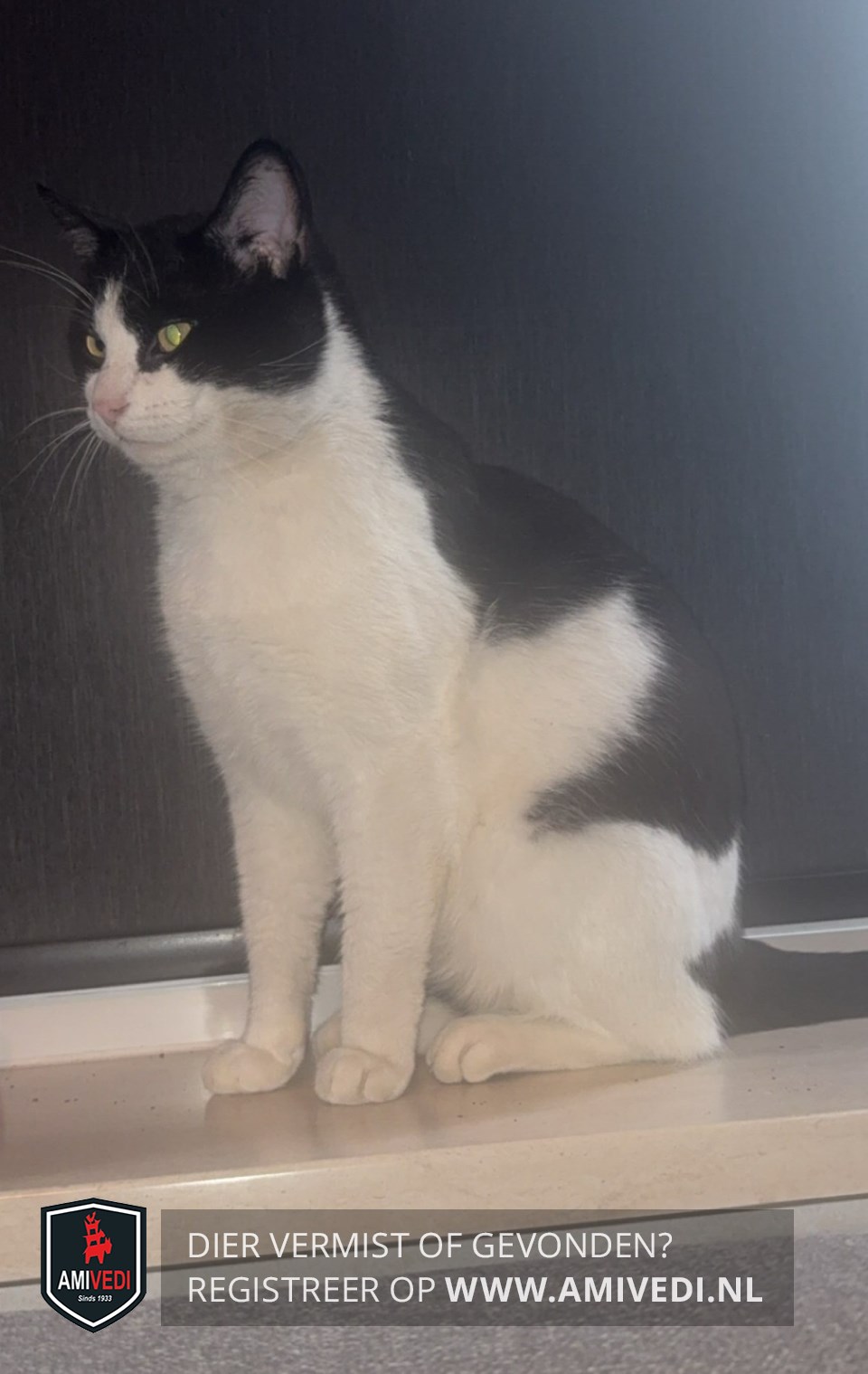 | Signalement | Wit/zwarte kater. Zwarte kop met witte bles en snuit. Witte kin, bef en borst. Zwarte rug en witte buik. Flanken en schouders zijn wit. Witte pootjes. Zwarte staart. |