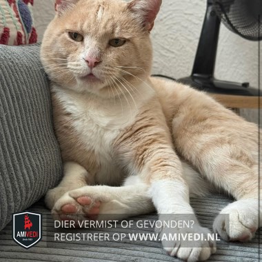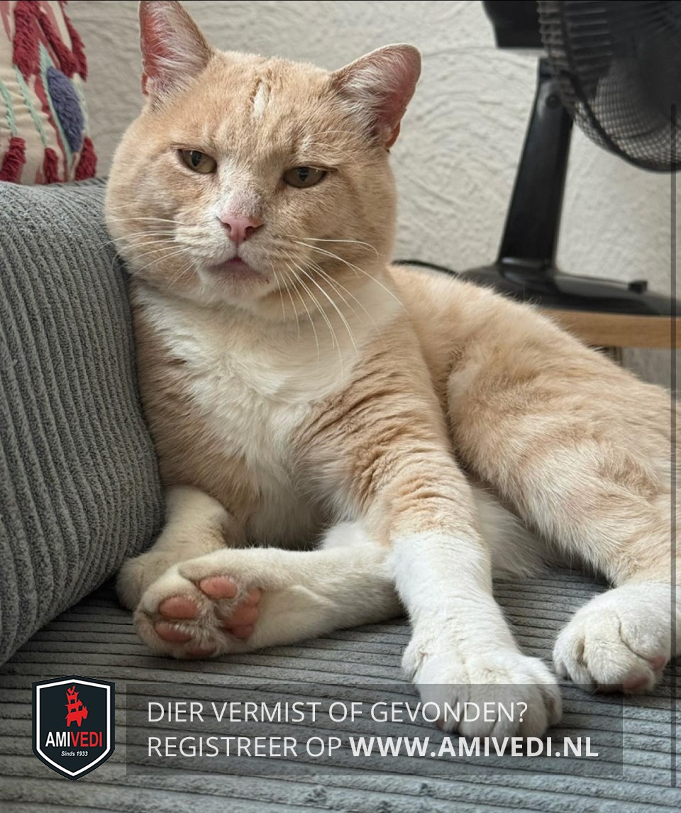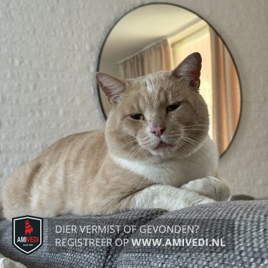 | Signalement | Licht oranje kleur met wit. Kop licht oranje. Midden op voorhoofd wit verticaal streepje. Witte boven de mond, op de kin, bef en borst. Rug, zijflanken en staart zijn licht oranje. Beide voorpoten licht oranje met witte sokjes. Achterpoten licht oranje met witte kniekousjes. Is een beetje vol van postuur. |