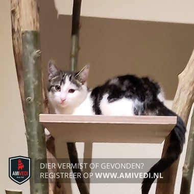 | Signalement | Wit met zwart tabby (cypers) jonge kat. Wit snoetje met een donker cypers kapje bovenop, roze neusje, witte borst en buik. Donker tabby patroon op de rug en flanken, met een zwart geringde staart. |