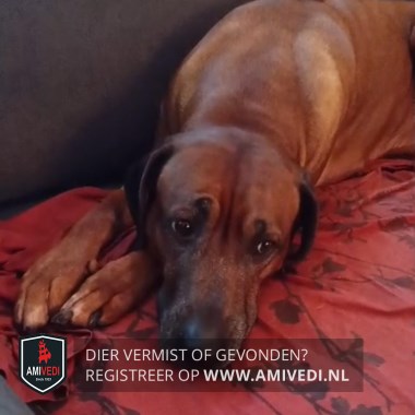 | Signalement | Bruine Rhodesian Ridgeback, rondom ogen iets zwart, bruine bles, met aan rechterkant bles ook ietsje zwart, zwarte neus, paar witte teentjes voorpoten |