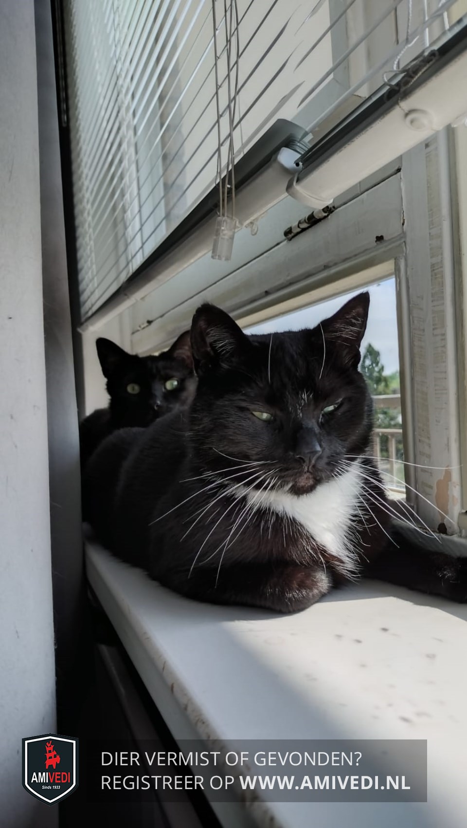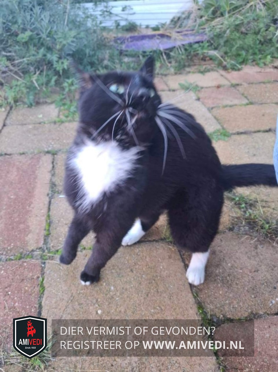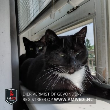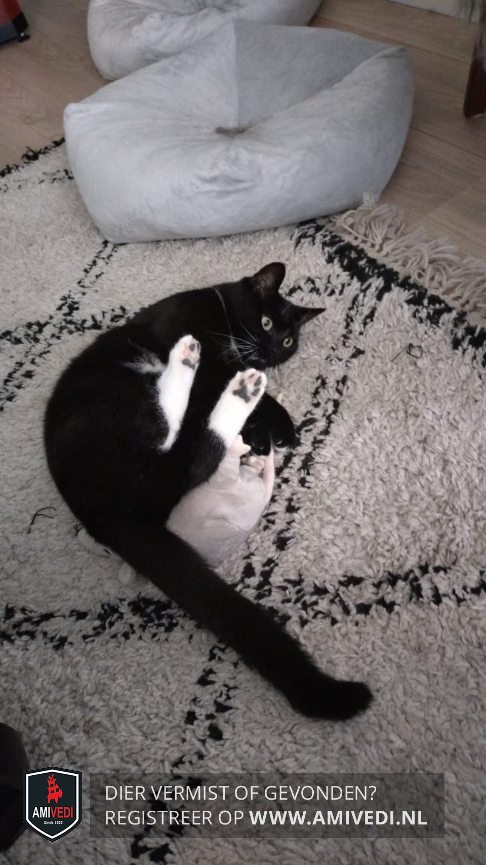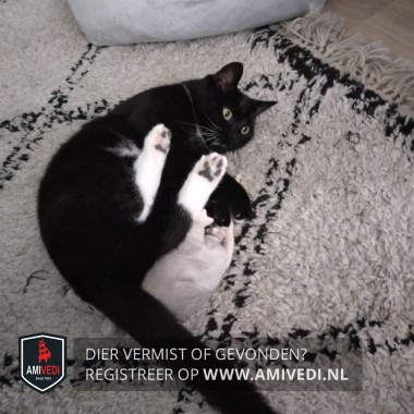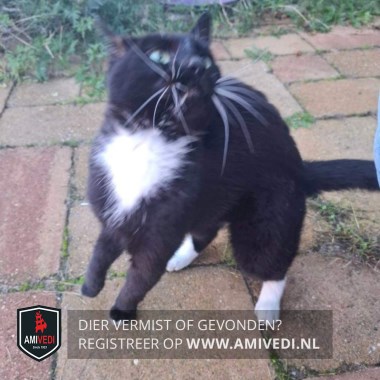| Signalement | Zwarte kop, rug, zijflanken, buik en staart. Tussen de ogen schuine streep van een paar witte haartjes naar voorhoofd. Schuine witte streep naast de zwarte kin. Beide voorpoten zwart, beide voorpoten hebben paar witte teentjes. Linker achterpoot zwart met wit sokje. Rechter achterpoot zwart met wit kniekousje. |