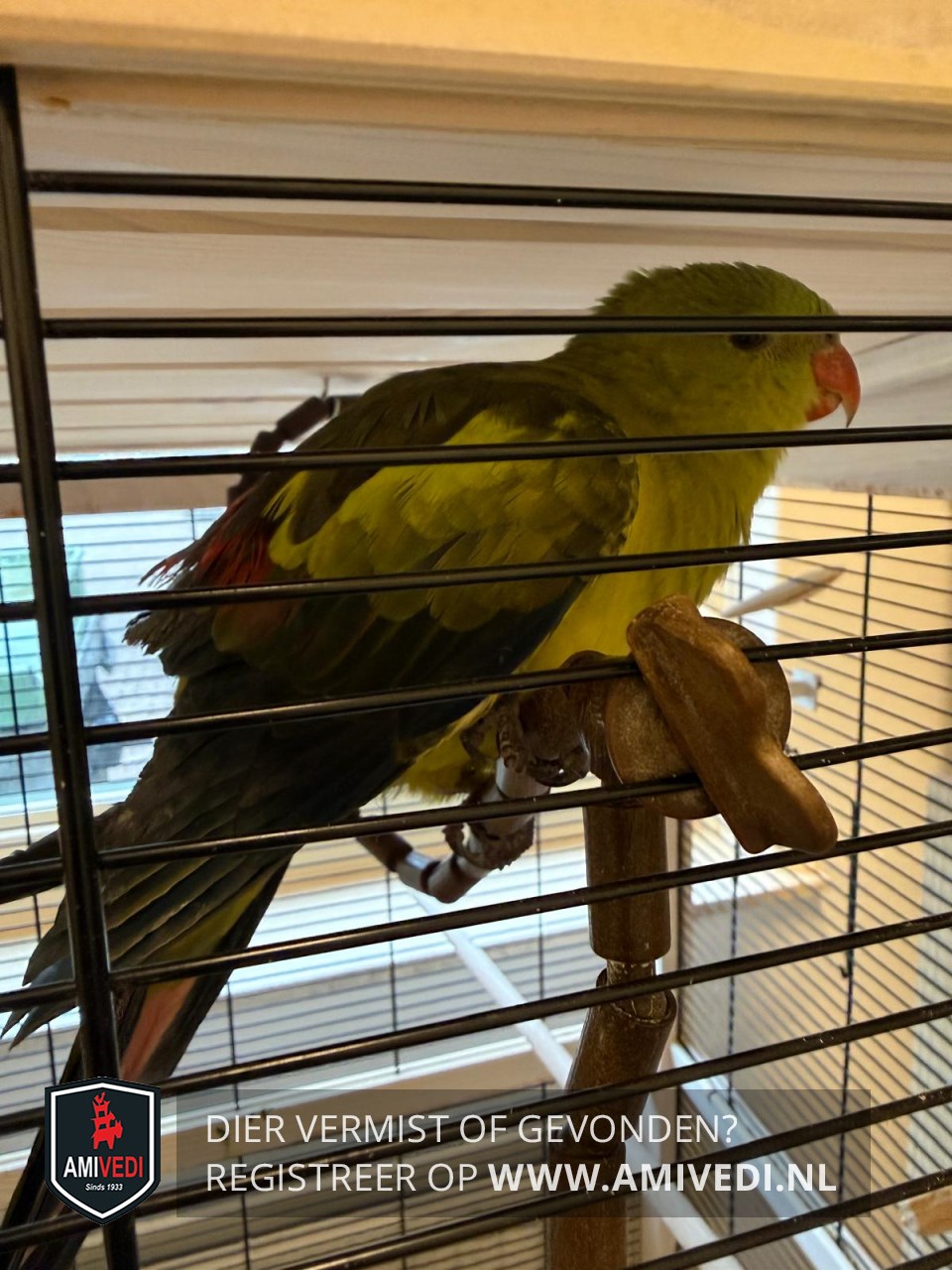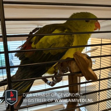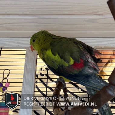 | Signalement | Bergparkiet (regentparkiet). Groene kop en groen lijf en vleugels, blauwe staart, wat rood op de vleugels. |