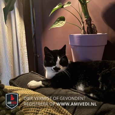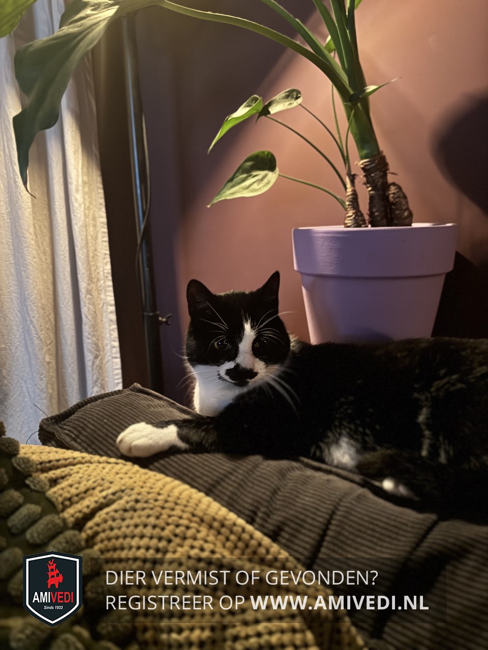 | Signalement | Zwart met wit, gele ogen, witte neusbrug, zwarte vlek/snorretje onder neus, witte kin, witte bef, witte borst, wit op voorpoten,wit op flank. |