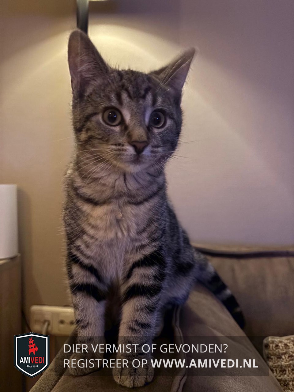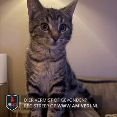 | Signalement | Cypers grijs/zwart met iets wit. Groen-gele ogen. Wit streepje aan de binnenkant van beide ogen. Wit kinnetje en wat wit onder de neus. 2 dikke zwarte strepen over de voorpoten. Licht buikje met zwarte vlekken. Staart is zwart geringd. |