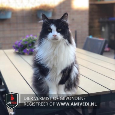 | Signalement | Zwart bovenop de kop, incl de oren, rondom de ogen, zijkant kop. Tussen de ogen wit, wit rondom de snuit en mond. Witte kin, bef, borst en buik. Rechter poot wit, linker poot zwart met een witte sok. |
