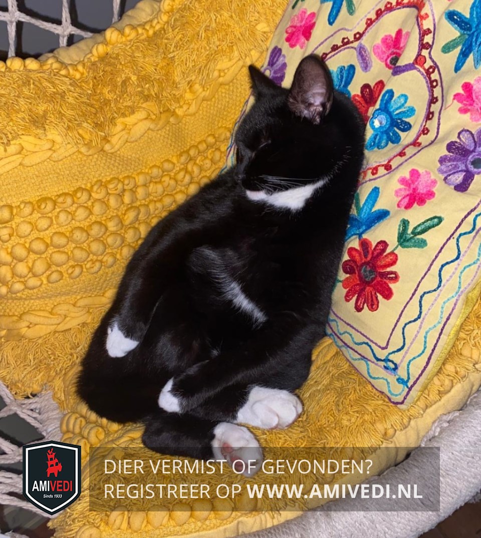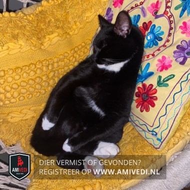 | Signalement | Zwart/witte poes. Bijna geheel zwart. Witte vlek op de kin, witte hals en bef. Dunne witte horizontale streep op de buik. Voorpootjes witte teentjes, achterpootjes witte sokjes. Erg schuw. |