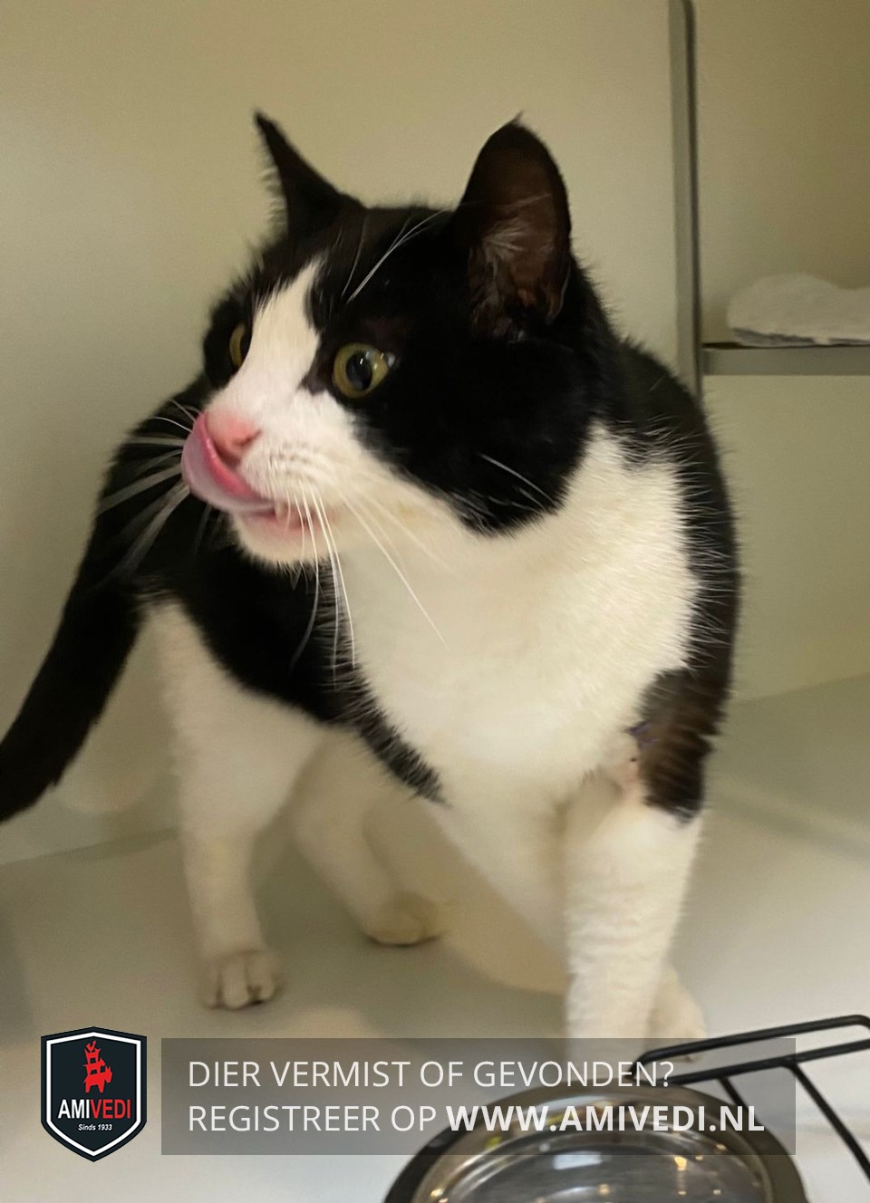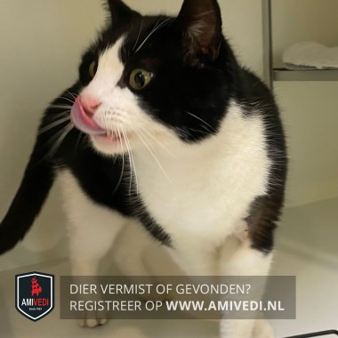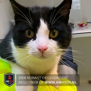 | Signalement | Zwart/witte gecastreerde kater. De bovenkant van het kopje is zwart met zwarte oortjes en zwart rondom de ogen. Een wit snoetje, het wit loopt door in een brede streep tussen de oogjes. Witte, kin, hals, borst en buik. Alle vier de pootjes zijn wit. De rug, de flanken en de staart is zwart. |