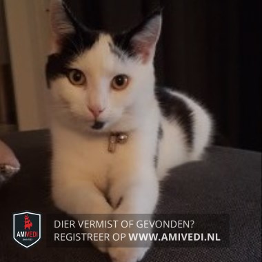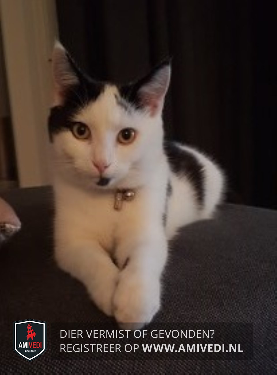 | Signalement | Zwart met witte kater met een verlamde staart, zwart tussen de oren , zwarte “sik”, zwarte vlekken op de rug. |