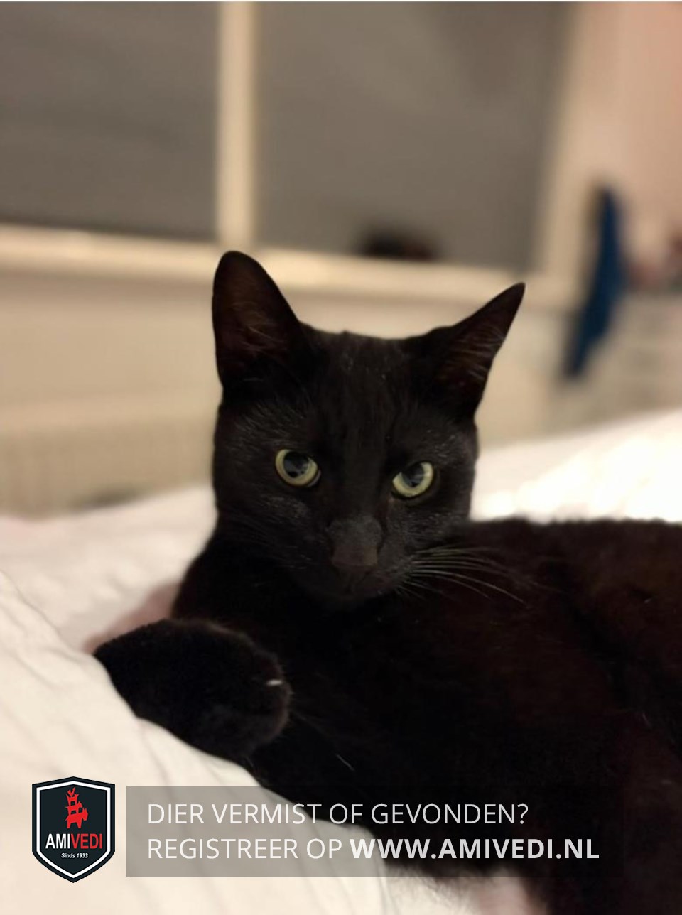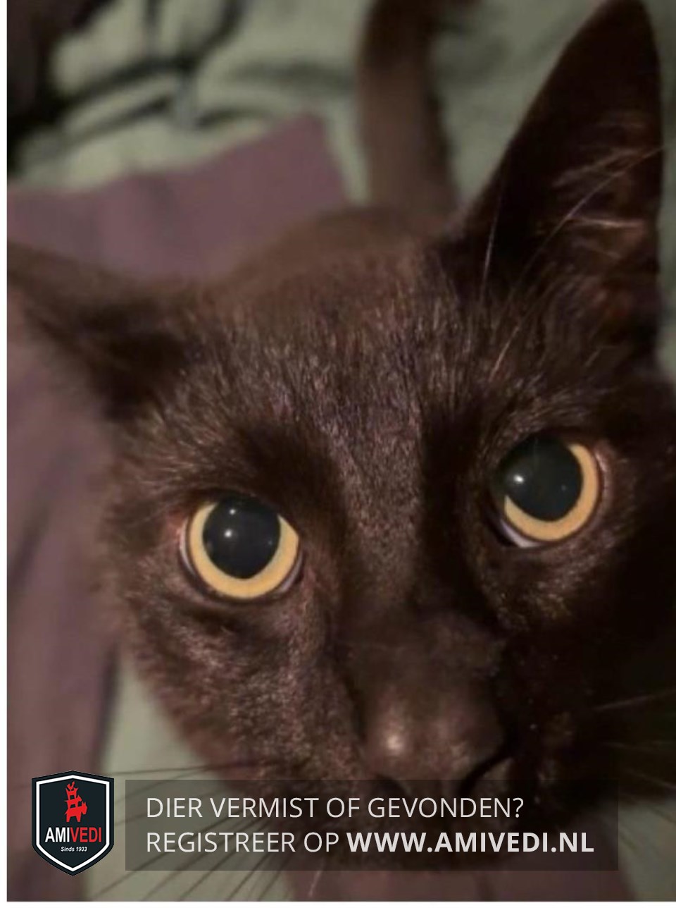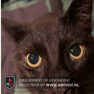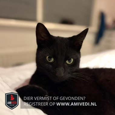 | Signalement | Zwart met paar witte haartjes op de bef,groene ogen, slank, grote oren. |