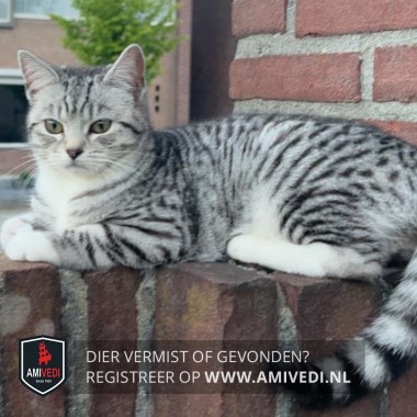 | Signalement | Cypers grijs/zwart gestreept, witte borst en voetjes, uiteinde staart zwart. |
