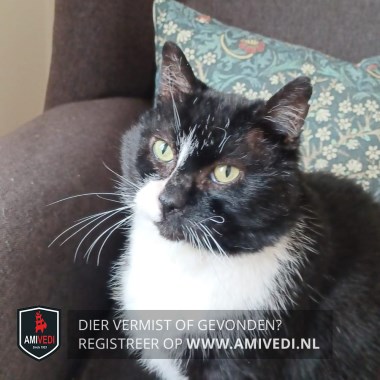 | Signalement | Mollige kat. Rechts op de bles een witte streep, rechts bij de snorharen wit. Rest van het kopje is zwart met wat witte haren erdoor. Linker oor is rafelig aan de rand. Witte bef, borst en buik. Voorpootjes hebben witte voetjes, linker achterpoot heeft ook wit. |