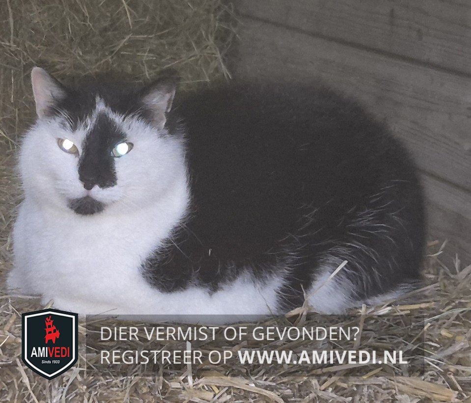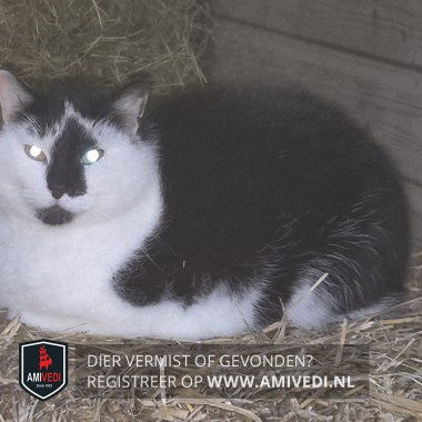 | Signalement | Zwart met wit. Wit kopje met zwart rondom de oren, een zwarte neusbrug, neus en onderlip. Witte hals, bles, borst, buik en poten. |