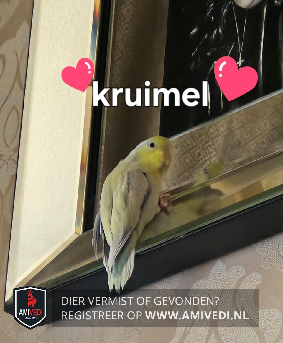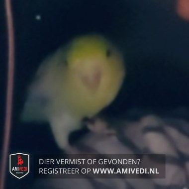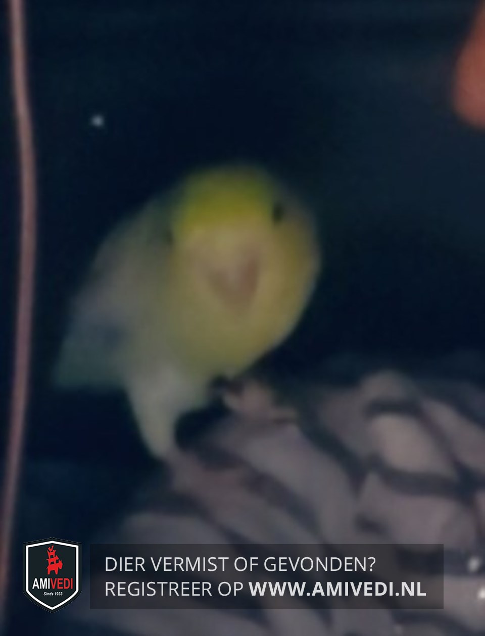 | Signalement | Forpus, klein vogeltje, lichtblauw, groen kopje en donkerblauw rond de kont met een paars ringetje. |