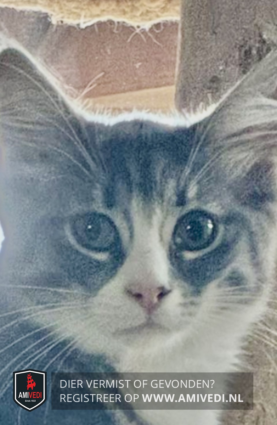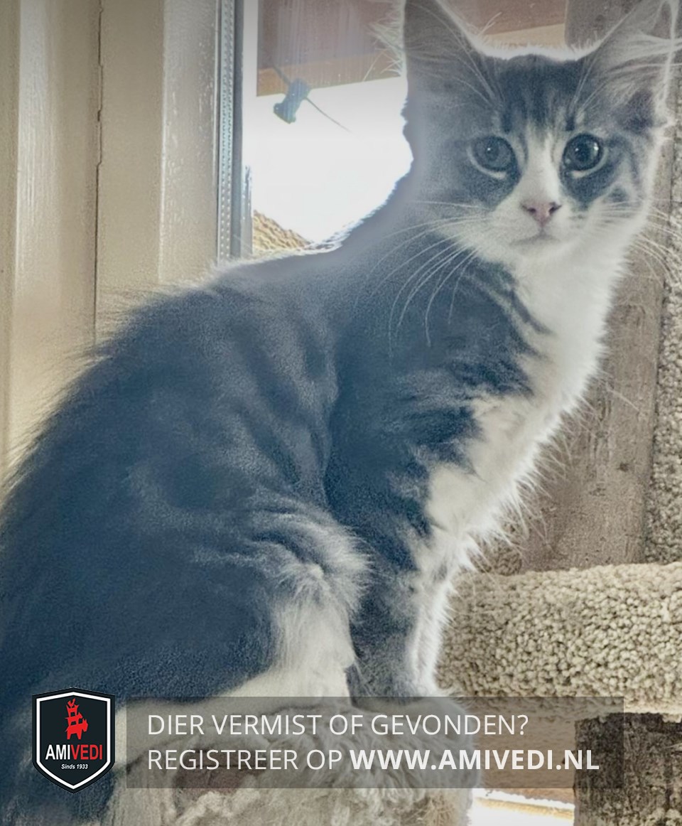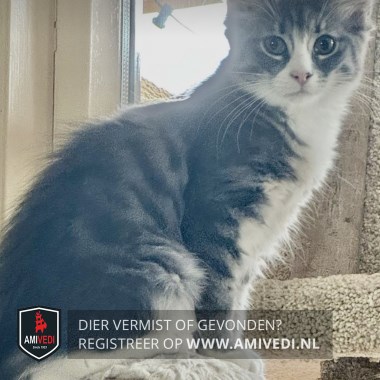 | Signalement | Grijs met witte boskat. Cypers grijs gestreept kopje met witte bles en wit rondom snuit. Boven het linkerneusgat een klein zwart vlekje. Witte kin, bef en borst. Grijs gestreept lijfje met witte buik. Rechtervoorpootje cypers grijs met een wit voetje. Rechterachterpoot is wit. Volle grijze staart. |