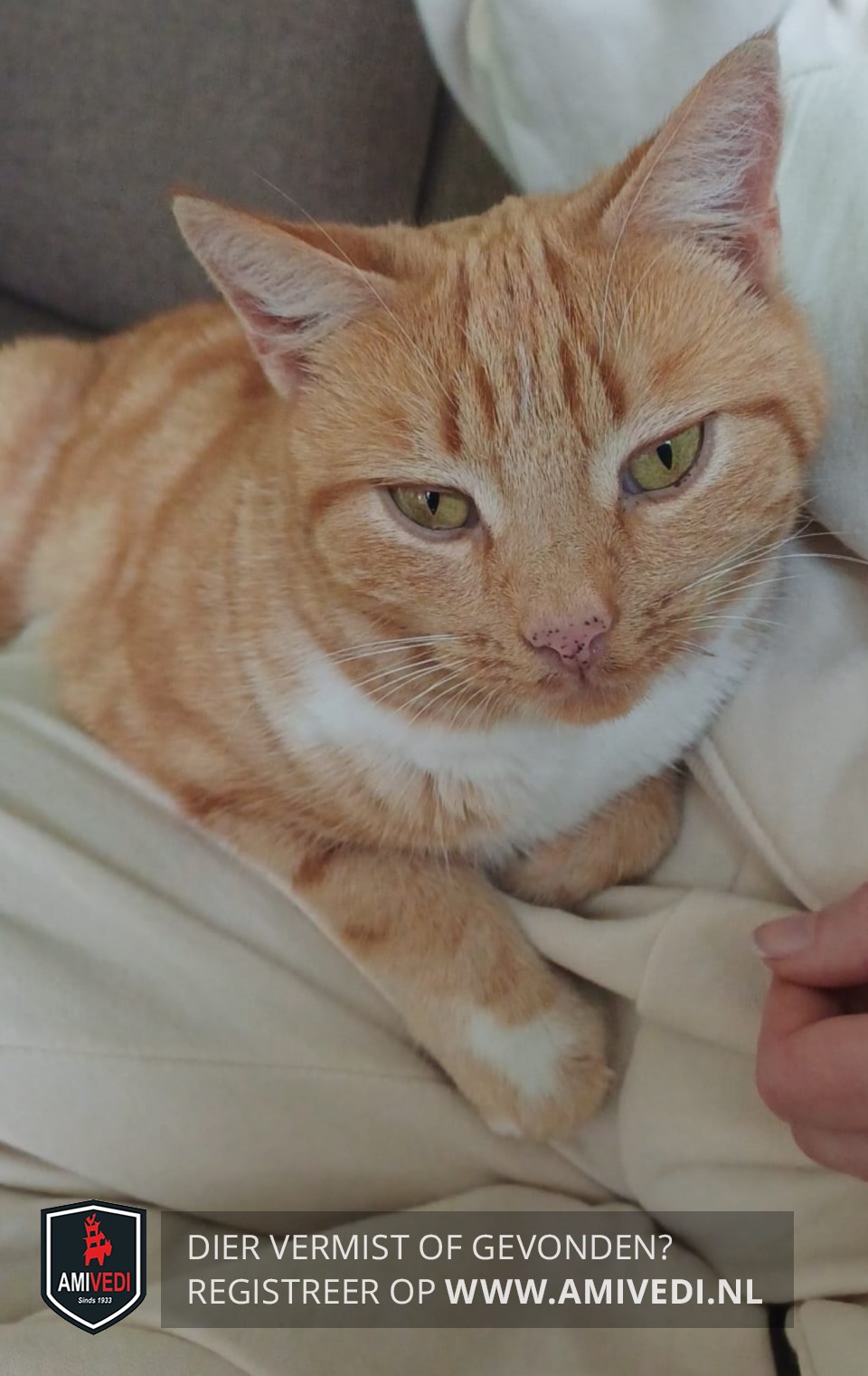 | Signalement | Cypers rood gemarmerd met wit. Witte bef en wit vlekje op rechter voetje voor. Verstopt zich graag in verschillende ruimtes, dus wilt u uw schuur etc. controleren? |
