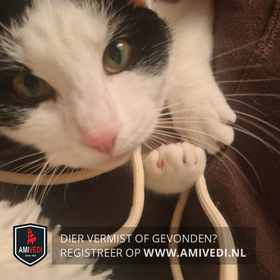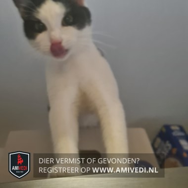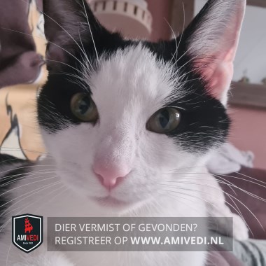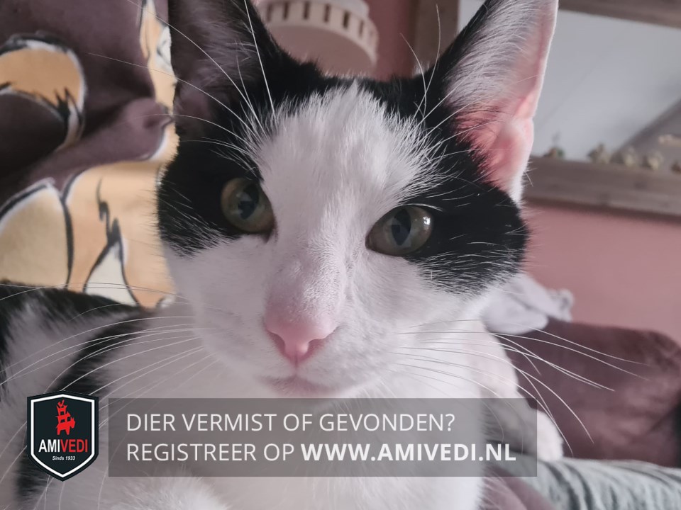 | Signalement | Zwart bovenop kopje en oren. Naast de ogen zwarte vlek. Witte hals, borst en buik.. Witte pootjes. Binnenkat dus angstig buiten. |