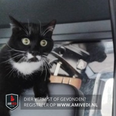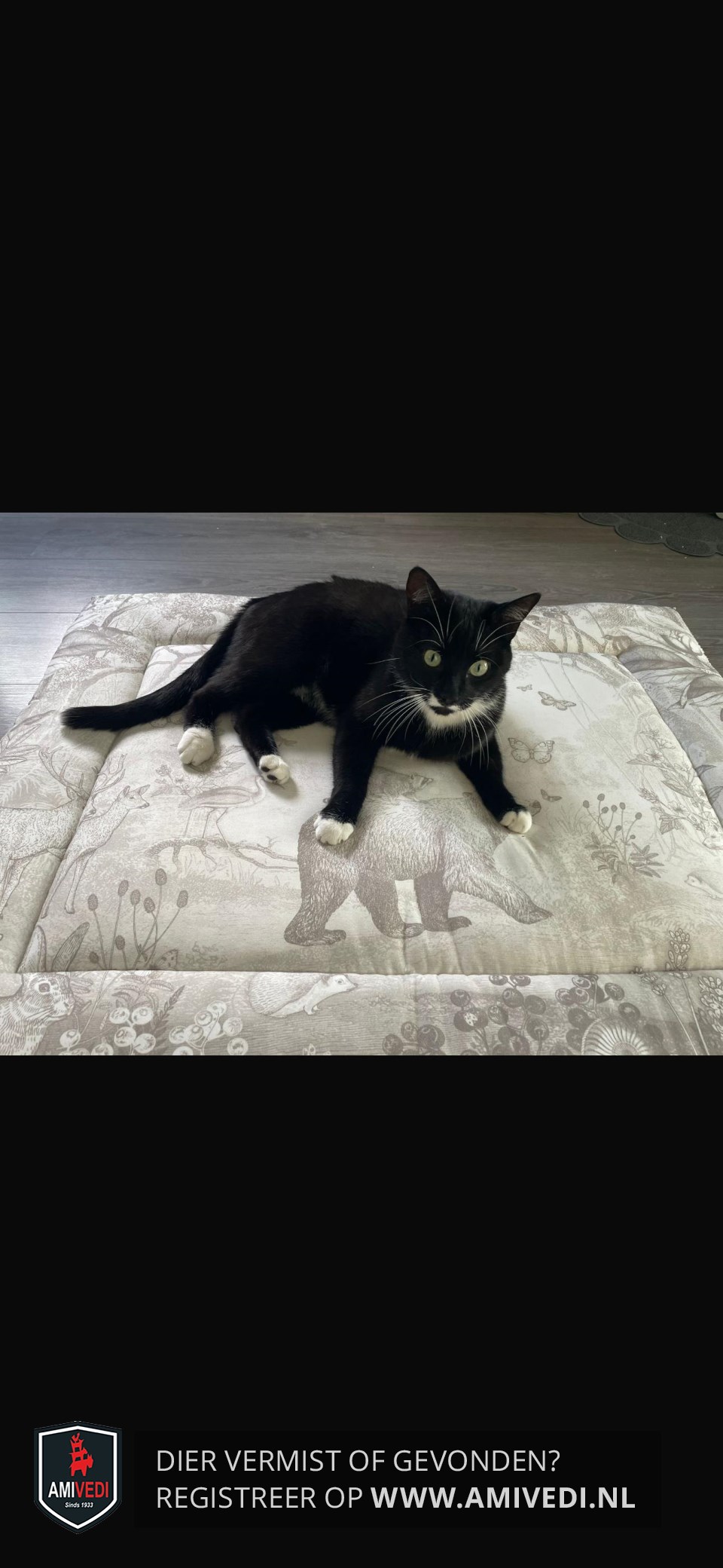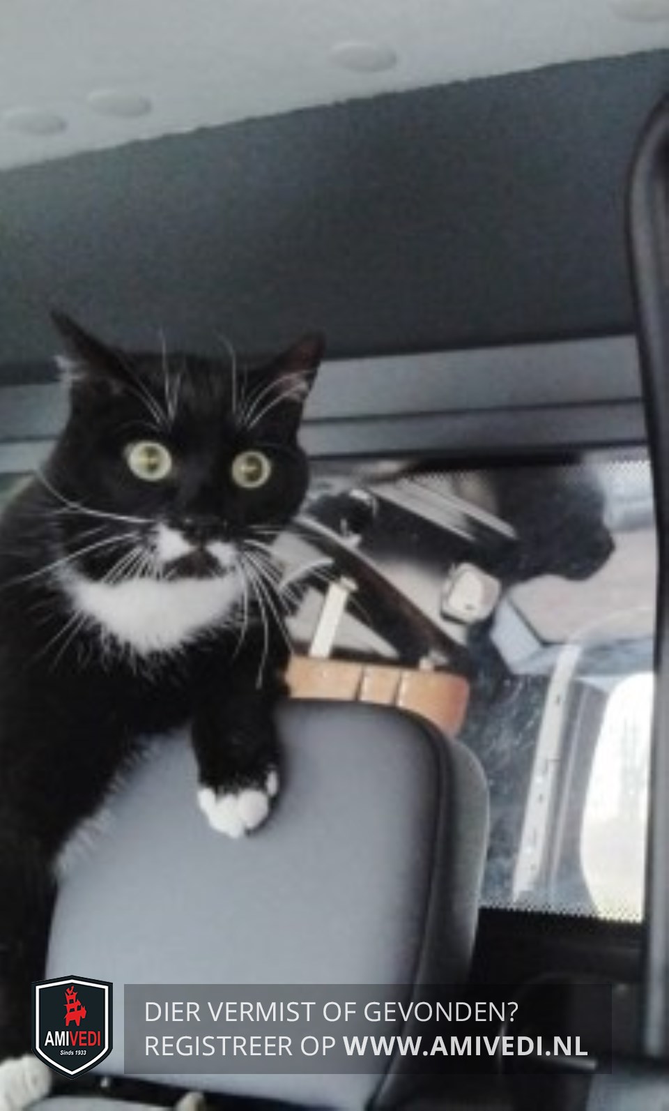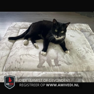 | Signalement | Zwart/wit zwarte kop, wit onder de neus met witte snorharen. Witte kin en bef. Witte teentjes. Wit puntje op het uiteinde van de staart speciaal voer vanwege blaas problemen. |
