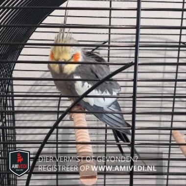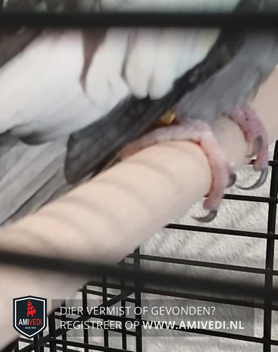 | Signalement | Grijs met gele kop en rode wangen, witte rand op vleugels. heeft een gouden ring. niet goed leesbaar |