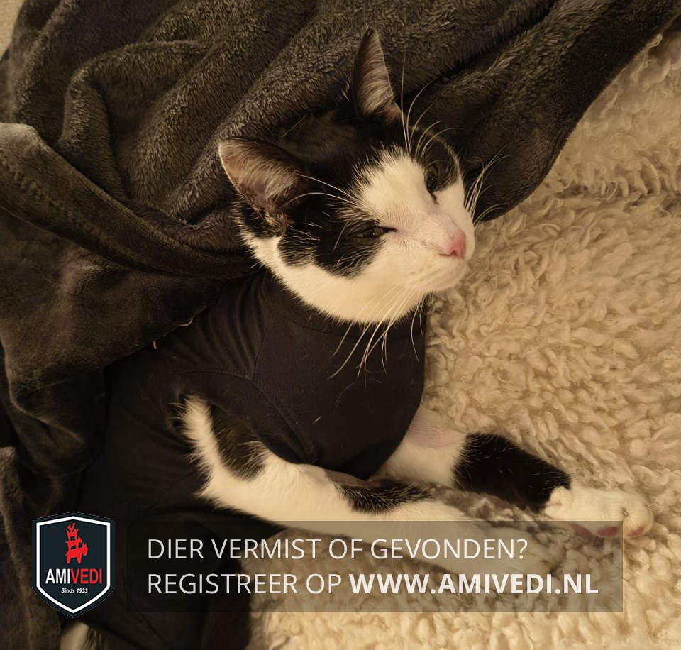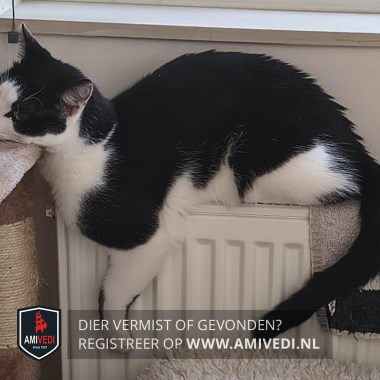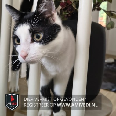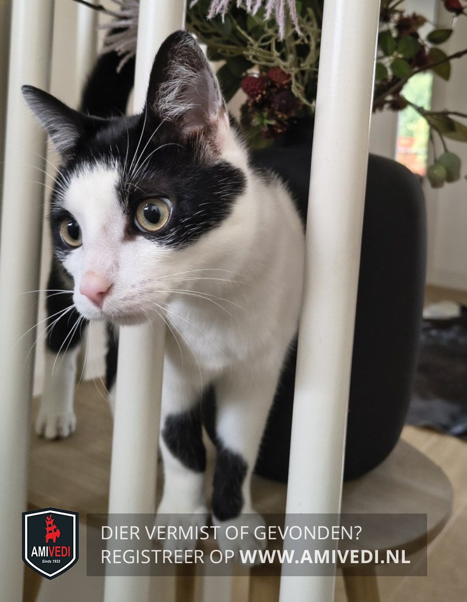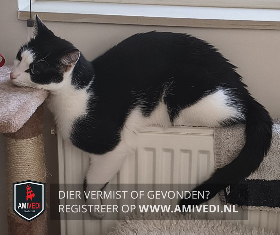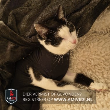 | Signalement | Zwart met wit. Brede witte bles, witte neus, bef, borst, voorpootjes wit en aan de binnenzijden twee zwarte vlekken, witte buik. Groot litteken op zijn buik van een recente operatie. |
