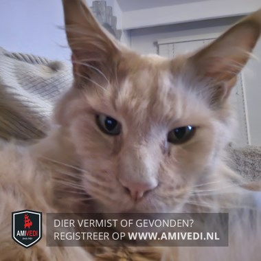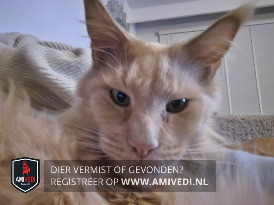 | Signalement | Maine Coon, kater, rood/oranje. Heeft speciaal voer nodig. |