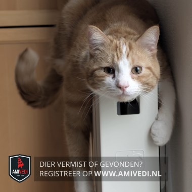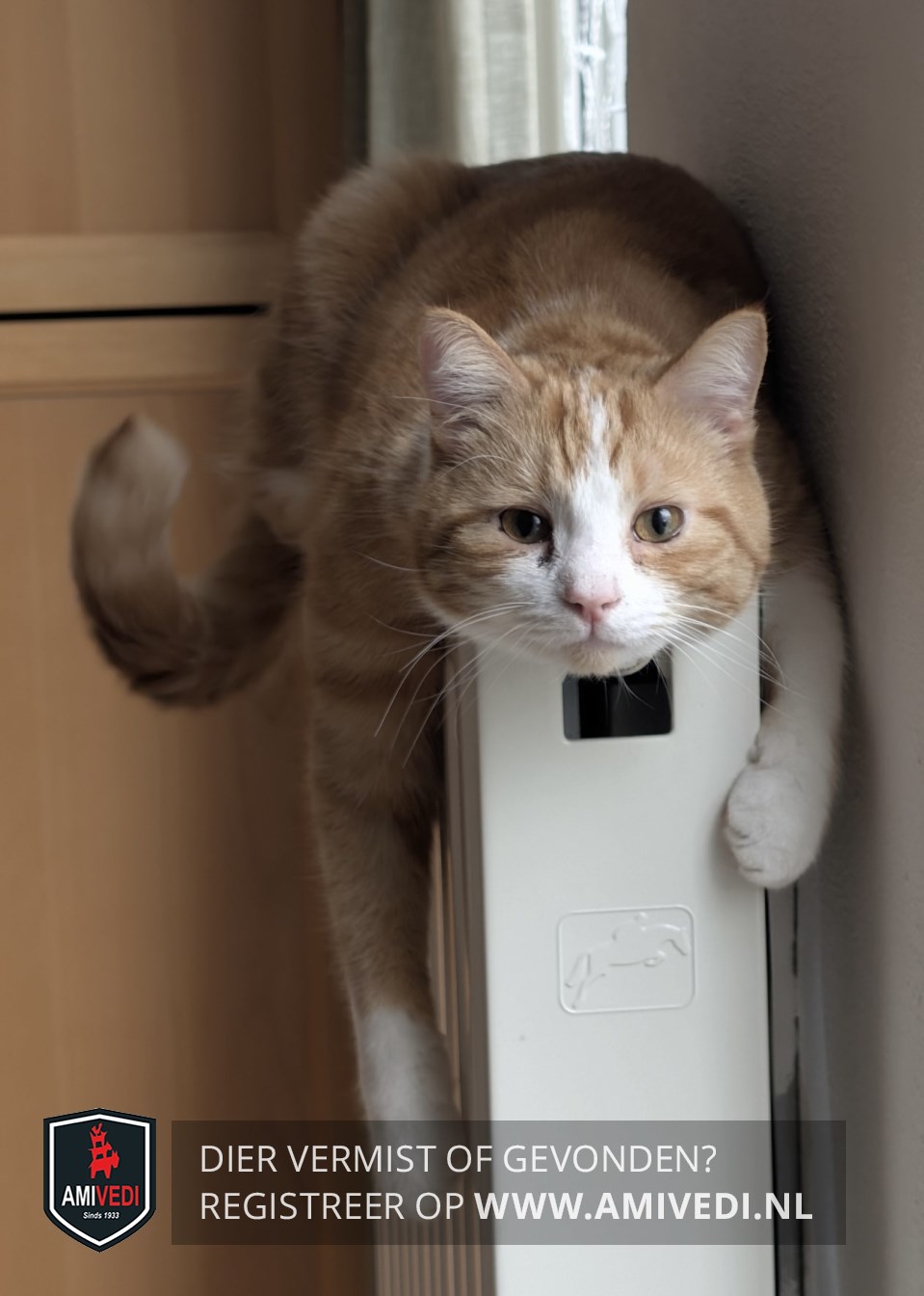 | Signalement | Cypers rood gestreept met witte bles, neusje, wangen en kin. Wit pootje links voor. Rechts voor witte sok. Klein traantje/vuil bij zijn rechter oog. |