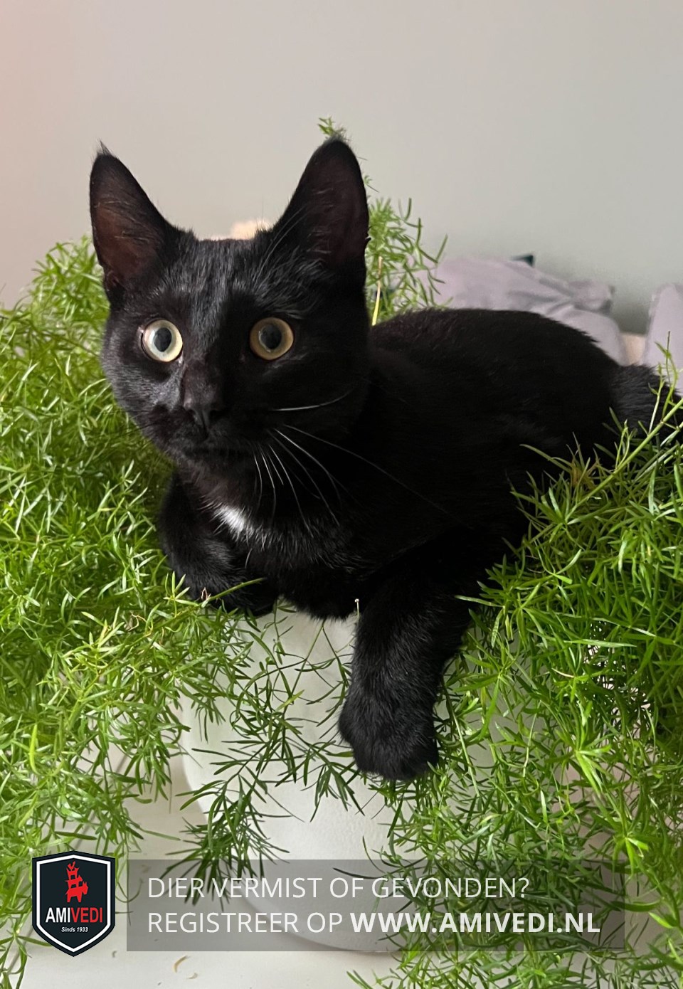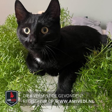 | Signalement | Frits is een lieve en waarschijnlijk aanhankelijke kat. Hij is zwart en heeft een wit vlekje op zijn kin, en een witte vlek onderop zijn buik. |
