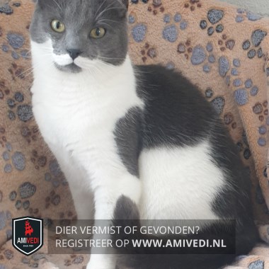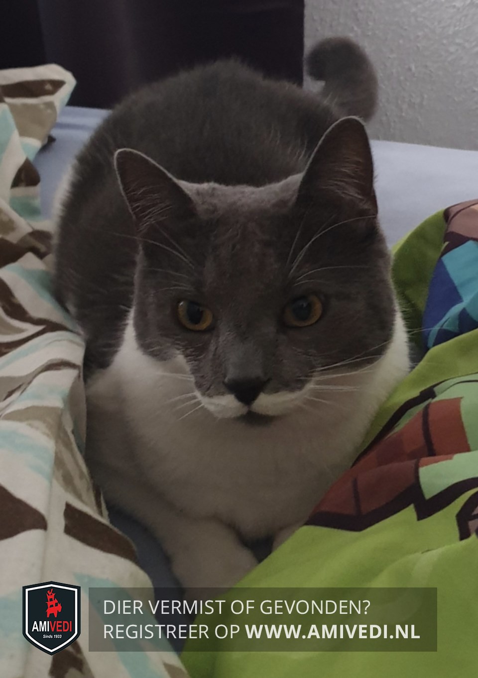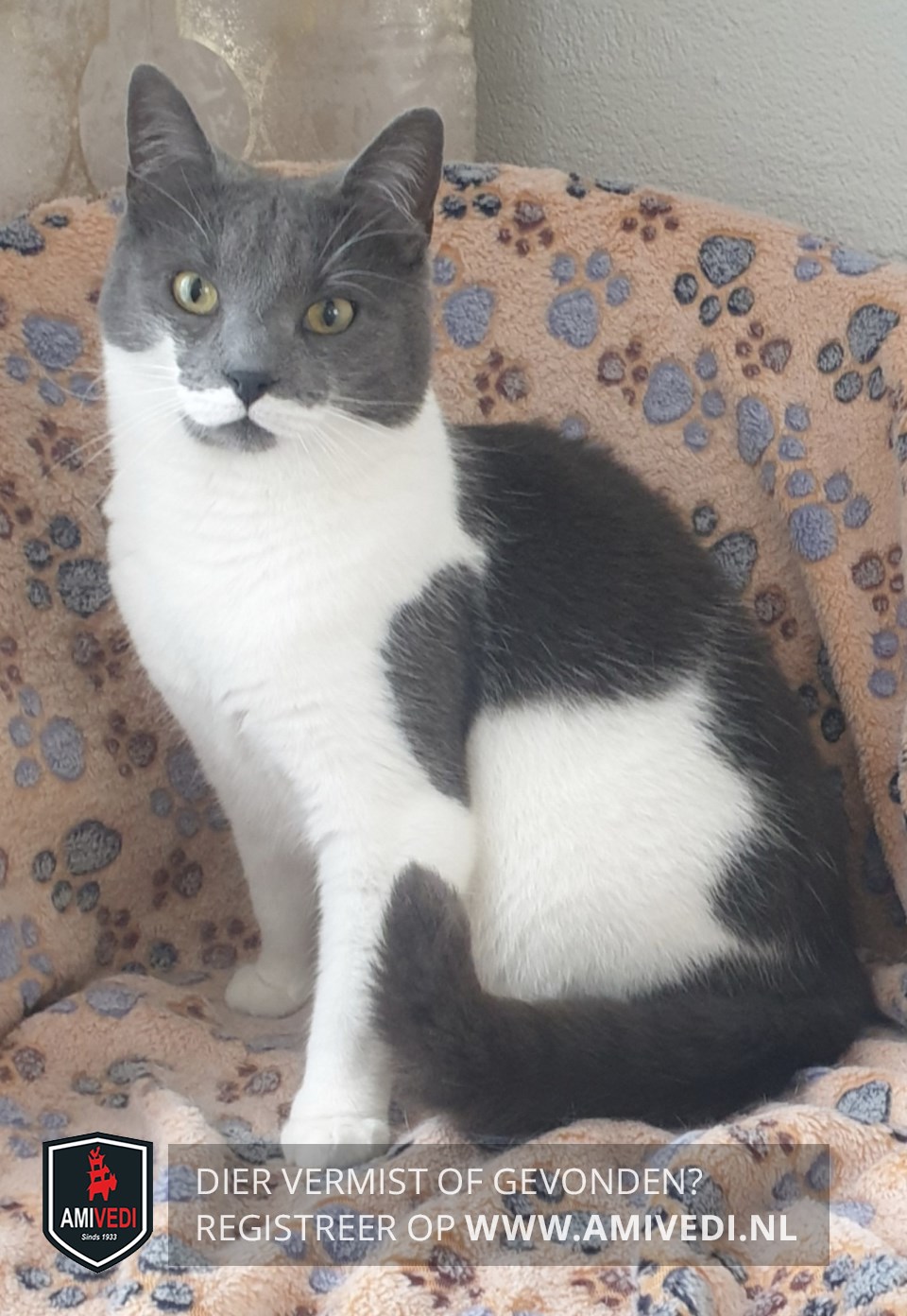 | Signalement | Muezza is grijs met wit. Grijze onderlip. |