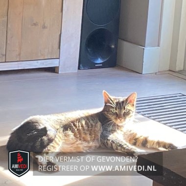 | Signalement | Kleine, slanke poes met bruin cypers patroon (grijs, bruin en zwart), vermoedelijk een kruising van Bengaal en Britse korthaar. Ze heeft lange oorharen, een rood stipje in haar oog, een roze neusje met zwarte omlijning en lange snorharen. Wit onder haar neus en op haar kin. Kortharige vacht, lichte buik en vier witte sokjes aan haar pootjes. |