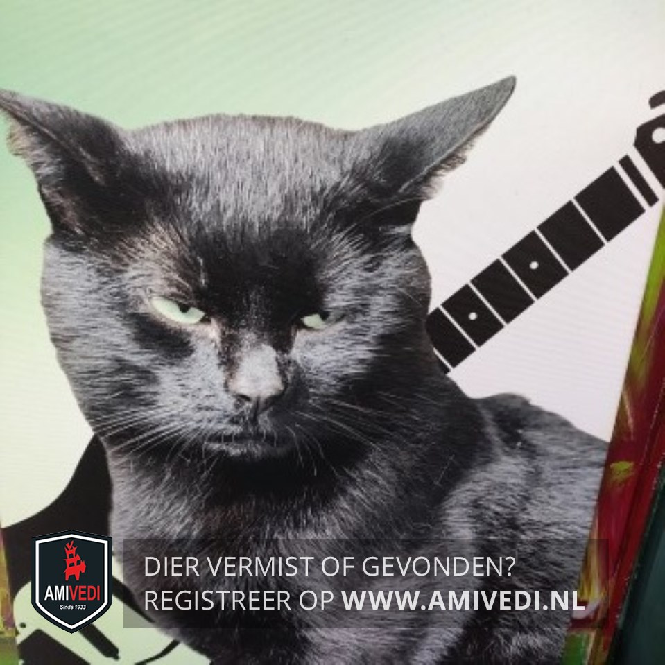 | Signalement | Geheel zwart, rechteroor iets kleiner dan linkeroor, gifgroene ogen. |