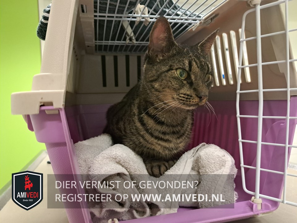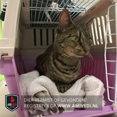 | Signalement | Cypers bruin/zwart gestreept, klein beetje wit op de kin. Donkere rug en staart. |