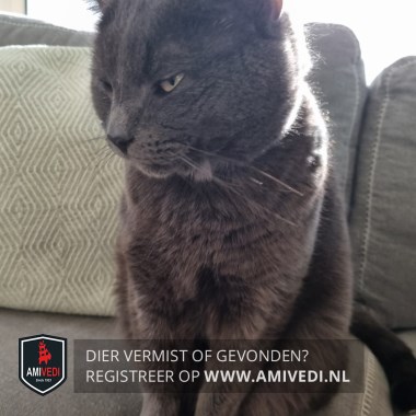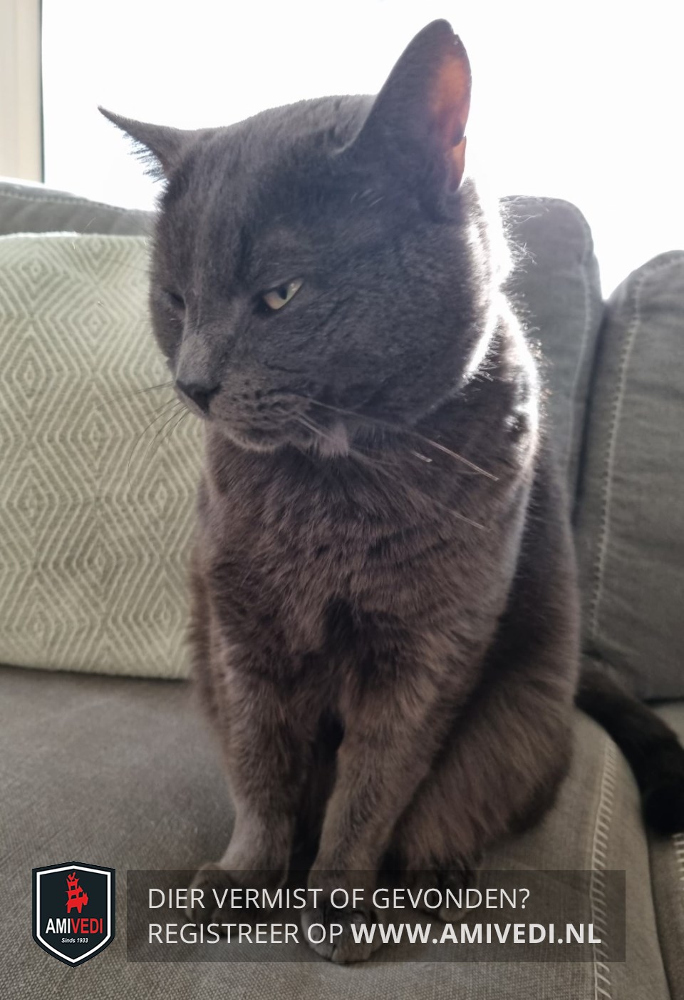 | Signalement | Volledig grijze kater, klein hapje uit linkeroor. Geel halsbandje. |
