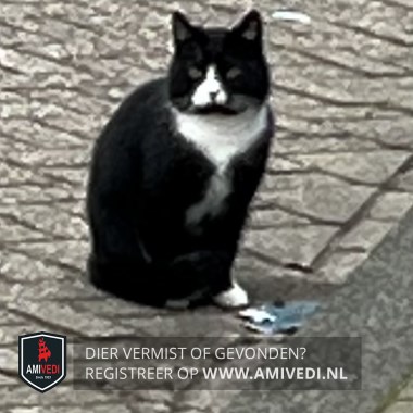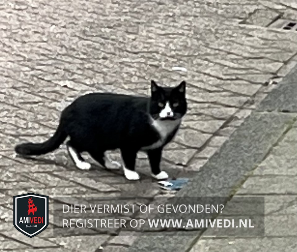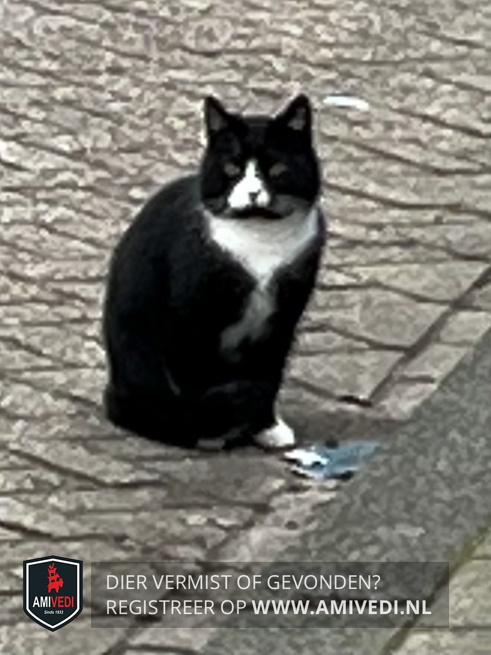 | Signalement | Zwarte kat met witte pootjes en befje |
