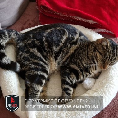 | Signalement | Grijs zwart gemarmerd met witte sokjes, wit befje, wit buikje met zwart en grijze vlekjes. Staart grijs zwart geringd. |