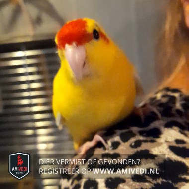 | Signalement | Agapornis, rood op het kopje, witte snavel, rood onder linkeroog, geel lichaam. |