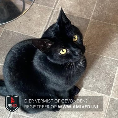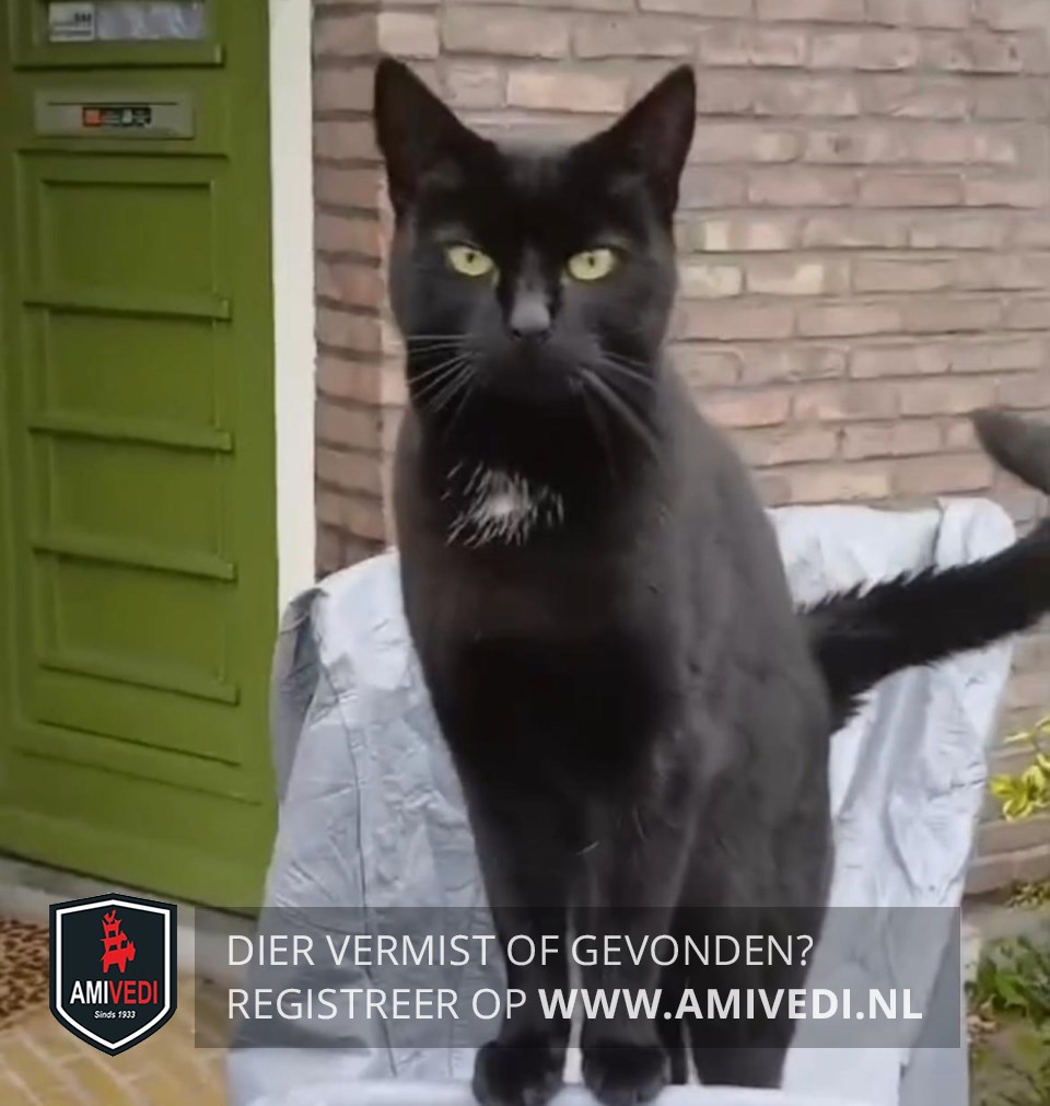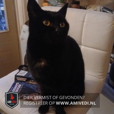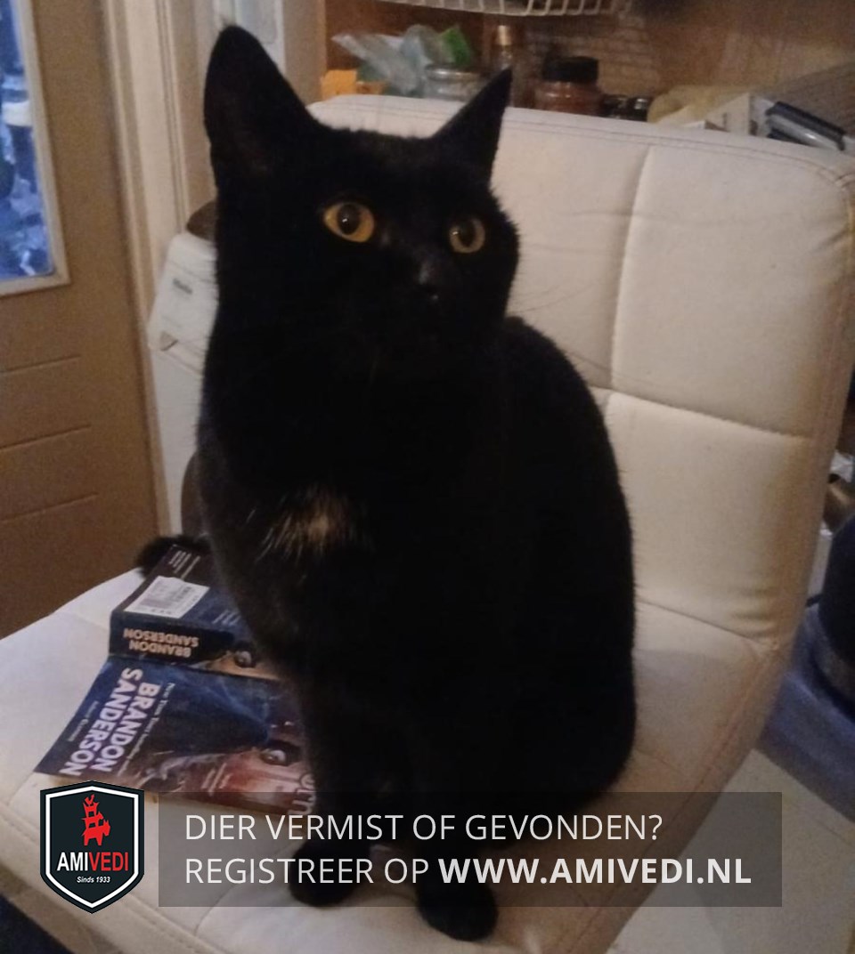 | Signalement | Geheel zwart met een klein wit plukje op de bef, gele ogen. Is afhankelijk van medicatie waardoor ze verward/angstig kan zijn. |