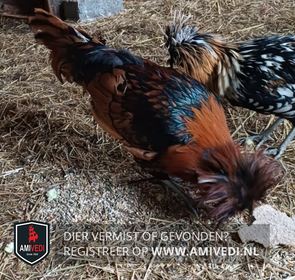 | Signalement | Padua haan met bruine, zwarte en blauwe veren |