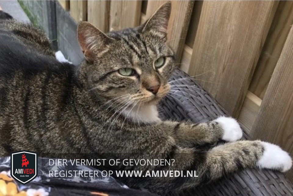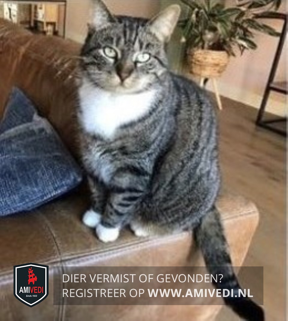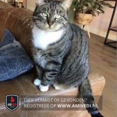 | Signalement | Cyperse grijs/zwart met witte poes. Cypers gestreept kopje, lichtbruin rondom het bekje. Witte kin en bef. Cypers gestreept lijfje en pootjes. De pootjes hebben allemaal witte sokjes. Het meest rechtse teentje aan de rechtervoorpoot heeft een donker vlekje. Geringde grijs/zwarte staart met een zwart uiteinde. |