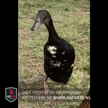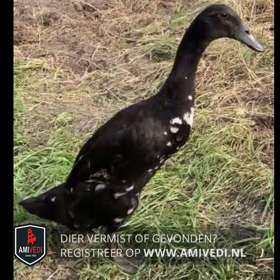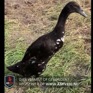 | Signalement | Zwart met witte loopeend, vlekken vooral op de buik, maar ook op de vleugels en staart witte vlekken, zwarte poten |
