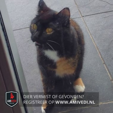| Signalement | Jonge schildpad poes (8 mnd). Zwart kopje met lichte randen onder de ogen. Witte bef. Oranje vlek op de borst. Gemêleerd zwart/oranje lijfje en pootjes. Rechtervoorpoot een oranje vlekje aan de buitenzijde poot net boven de voet en witte teentjes. Linkervoorpoot witte teentjes. Linkerachterpoot wit voetje met daarboven een oranje vlek. |